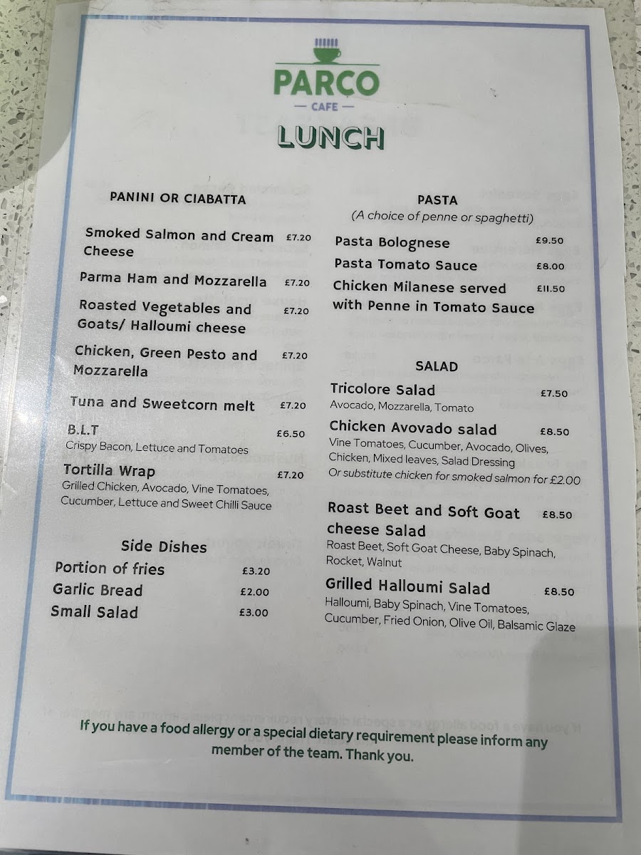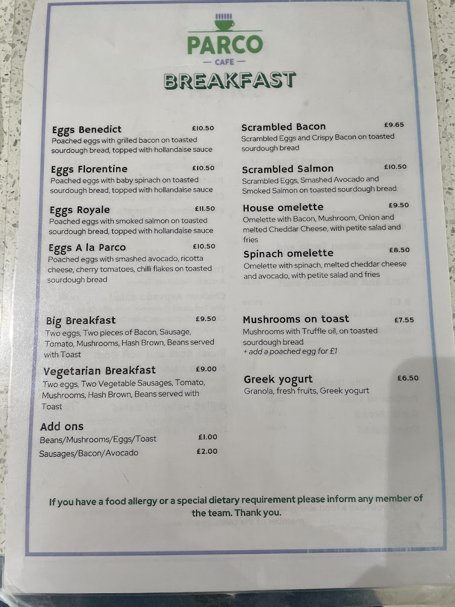 Welcome to Parco Cafe, a delightful culinary gem located at 190 Fentiman Rd, London. The menu offers an inviting array of dishes, making it perfect for any meal of the day. Start your morning with decadent options like Eggs Benedict or the hearty Big Breakfast. Lunchtime brings mouthwatering pasta selections, including Homemade Lasagna and Grilled Vegetables in Tomato Sauce, ensuring there's a dish for every palate.